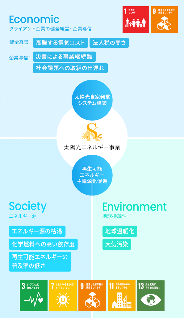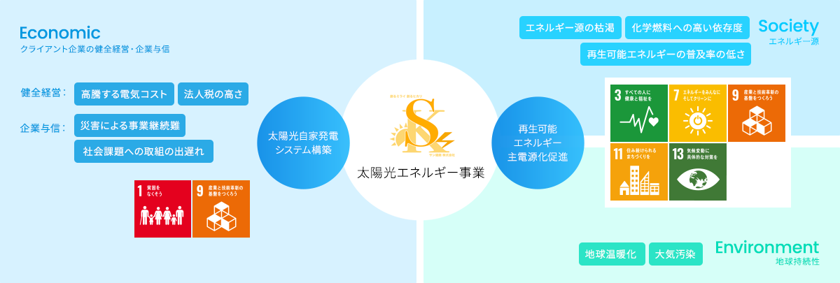 持続可能な社会へ貢献するため、私たちは事業や製品を通じて社会課題の解決に取り組みつつ、経営に必要な経済的効果を得られる、CSV経営を推進しています。太陽光自家発電システムを企業に向けて構築することで、その企業の健全経営と起業与信へと貢献し、さらには、多くの企業へ再生可能エネルギーの主電源化を促進することで、社会問題として掲げられているエネルギー源や地球環境を維持するための課題であるCO2を削減することにより、気候変動への具体的な対策へアプローチします。